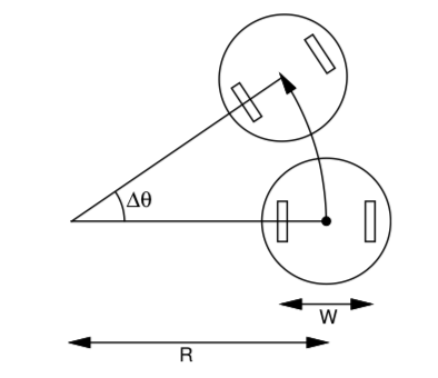 \[\Delta_\theta = \frac{Dis_R}{R_R} = \frac{Dis_L}{R_L} = \frac{V_R \Delta_t}{R + W/2} = \frac{V_L \Delta_t}{R-W/2}\]