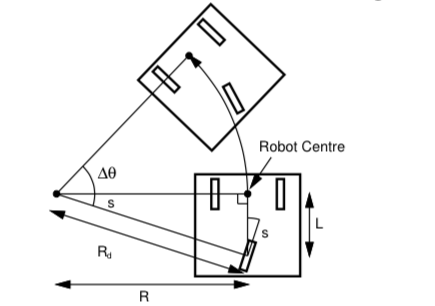 考虑从动轮和舵轮的垂直距离为\(L\),显然有从动轮中心点旋转半径\(R= \frac{L}{\tan{s}}\),且有舵轮线速度\(v = \omega R_d\),即\(\frac{\Delta_\theta}{\Delta _t} = \frac{v \sin{s}}{L}\)。